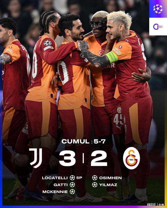 尤文图斯主场3-2加拉塔萨雷,总比分5-7出局。加拉塔萨雷晋级16强,将对阵热刺或利物浦。托雷拉送点,洛卡特利点射,凯利被直红罚下,卡卢卢助攻加蒂破门,麦肯尼再下一城,总比分5-5进入加时。加时赛上半场奥斯梅恩破门,下半场伊尔马兹再下一城。