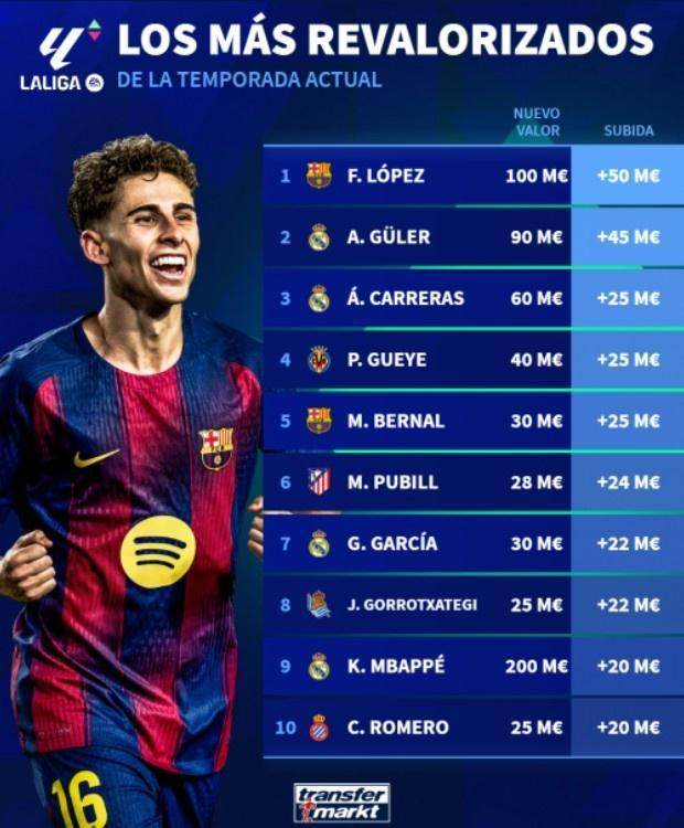 西甲身价涨幅榜:费尔明涨5000万欧最多