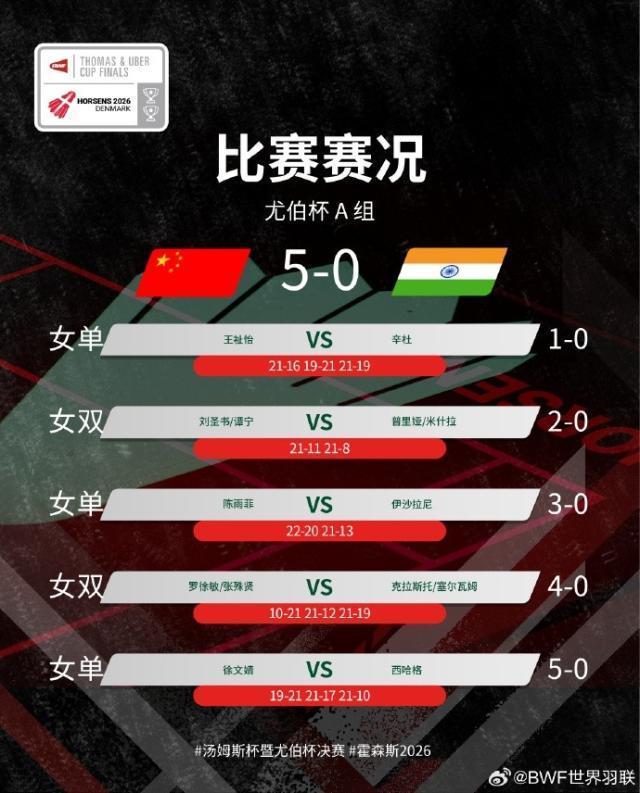 2026年汤尤杯小组赛,中国5比0横扫印度小组头名晋级淘汰赛。中国5比0印度,徐文婧鏖战三局逆转战胜对手,中国队拿下三连胜,小组头名晋级淘汰赛。